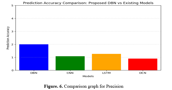 The graph contrasts the predictive power of the suggested DBN algorithm to that of pre-existing models (CNN, LSTM, and DCN). Lists provide algorithms and correctness metrics. A bar graph has been generated using Matplotlib, with the X-axis showing predictions and the Y-axis reliability of forecasts. For improved visualization, the Y-axis range is 0 to 5, and the X-axis separates types. For simplicity, axis labels, a title, and a grid along the Y-axis improve accurate comparative usability.